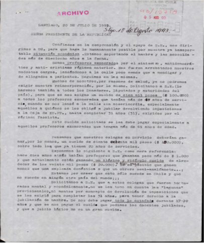 “Una de las formas que tomó la represión política, fue el despido masivo de trabajadores de la administración pública y de algunas de las empresas intervenidas por el Estado durante el gobierno de la Unidad Popular que fueron sindicados como miembros o simpatizantes del gobierno de Salvador Allende. La exoneración fue posible por las firmas forzadas de renuncias, de finiquitos o de actas de despido, la supresión de cargos o la prohibición de ingreso a los lugares de trabajo, incluso la detención y por tanto la ausencia en el lugar de trabajo, fueron razones que justificaron los despidos. La dificultad de encontrar trabajos estables o la cesantía prolongada debido a la persecución política, significaron para los exonerados años de cesantía y empleos sin previsión por lo que las condiciones para la jubilación eran muy precarias. De acuerdo a las cifras del libro de Lira y Loveman, para el año 2003, la cantidad de personas beneficiadas por la ley 19.234 fue de 14.508, y aquellos acogidos a la ley 19.582 fueron 59.444 personas, según un informe de la subsecretaría de Previsión Social. En la propuesta de derechos humanos “No hay mañana sin ayer”, entre 1993 y 2003, se reconoció la calidad de exonerado político 86.208.” Fuente: Gahona, Y. (2009) Reparación por violaciones de derechos humanos. Estudio exploratorio descriptivo sobre contenidos subjetivos asociados a la restitución, indemnización, rehabilitación, satisfacción y garantías de no repetición (reparación) en familiares y sobrevivientes de violaciones de derechos humanos en Chile. Tesis para optar al Grado académico de Magíster en Ciencias Sociales, mención Sociología de la modernización. Departamento de Sociología, Facultad de Ciencias Sociales, Universidad de Chile. Santiago, Chile. Fuente: Loveman, B. y Lira, E. Política de Reparación. Chile 1990 - 2004. Editorial LOM. Santiago, Chile. Páginas 301 y siguientes.