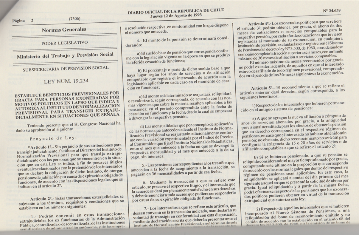 - Ley 19.234: Establece beneficios previsionales por gracia para personas exoneradas por motivos políticos en lapso que indica y autoriza al instituto de normalización previsional para transigir extrajudicialmente en situaciones que señala. 12/08/1993 (Extraído de la página web: https://www.bcn.cl/leychile/navegar?idNorma=30601&idVersion=1993).