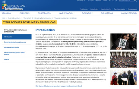 - Decreto Exento N° 0030766 de la Universidad de Chile: Crea distinciones universitarias de título póstumo y simbólico y grado académico póstumo y simbólico para ex estudiantes de la Universidad de Chile, y aprueba normas para su otorgamiento. 23/08/2017 (Extraído de la página web: https://uchile.cl/dam/jcr:dab47f7f-7b12-4bdc-8341- 9aa33b37f00a/0030766-crea-distinciones-universitarias-de-ttulos-pstumos-y-simblico-y-grado-acadmico-pstumo-y-simblico-y-grado-acadmico-pstumo-y-simblico-para-ex- estudiantes-de-la-u-de-chile.pdf)