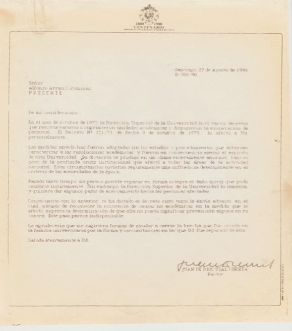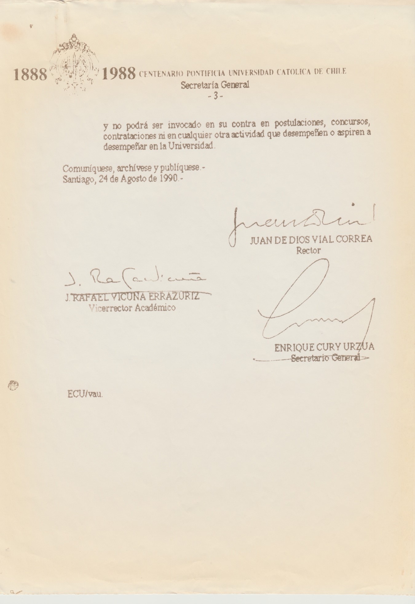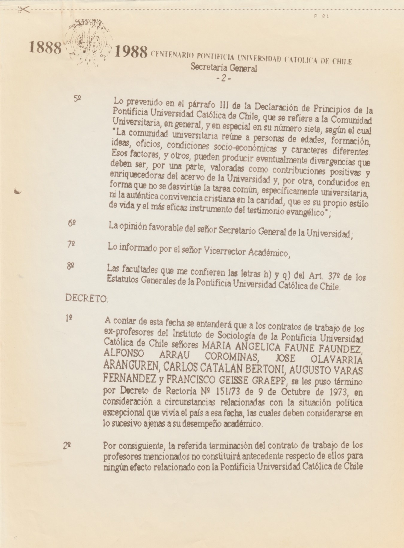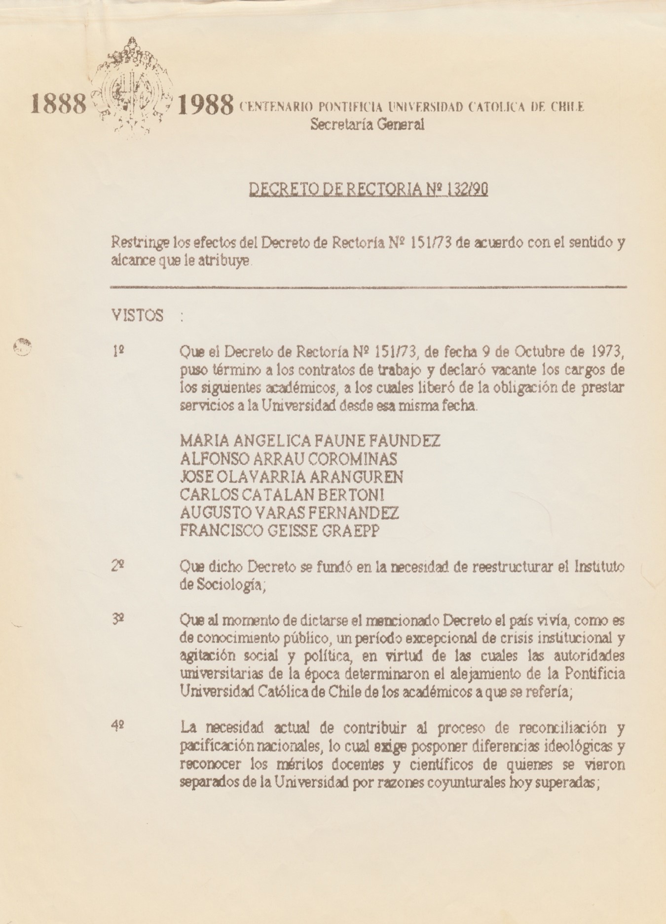 Después de 17 años de dictadura, recién iniciado el nuevo ciclo democrático en el país, el rector Juan de Dios Vial Correa, envió una carta a los académicos exonerados señalando que tales expulsiones “fueron adoptadas sin los estudios y procedimientos que deberían caracterizar a las resoluciones académicas y fueron en consecuencia ajenas al espíritu de esta Universidad”, y dictó el Decreto que en su inciso segundo dice: “Por consiguiente, la referida terminación del contrato de trabajo de los profesores mencionados no constituirá antecedente respecto de ellos para ningún efecto relacionado con la Pontificia Universidad Católica de Chile y no podrá ser invocado en su contra en postulaciones, concursos, contrataciones ni en cualquier otra actividad que desempeñan o aspiren a desempeñar en la universidad”.