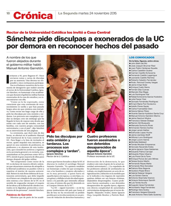 Desde hace unos meses, a partir de una iniciativa de la Rectoría, y con el apoyo de una comisión de profesores, ex profesores y ex alumnos de la UC, hemos estado trabajando en un acto que permita avanzar en un tema pendiente. Lo hemos hecho con el convencimiento de que era importante y necesario de abordar. Hemos revisado de manera dedicada y minuciosa nuestros archivos y registros en Secretaría General y Rectoría, focalizando nuestra atención en los procesos de exoneraciones de los profesores que ocurrieron entre los años 1973 y 1975, siendo la gran mayoría de ellos poco tiempo después del golpe militar.