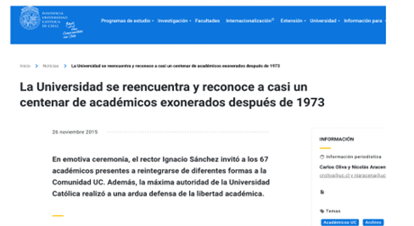 Como es de todos conocido, en el año 1973, y en relación al quiebre de la democracia y el golpe militar en el país, nuestra universidad perdió su autonomía por una intervención externa del estado y ocurrieron hechos que hoy lamentamos profundamente. Estos hechos se enmarcan en uno de los momentos más duros y dolorosos de la historia de nuestro país. Nuestra tradición desde la fundación de la UC, ha sido proteger la autonomía universitaria. Esta tradición se quebrantó al aceptar que de manera externa a ella, se aceptara que un grupo importante de profesores, -dentro de ellos todos ustedes-, fueran exonerados por motivo de sus ideas y convicciones. Esto no debió haber ocurrido nunca, independientemente de las circunstancias y el contexto político de la época.