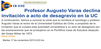 Aprovechando el espacio de debate creado por La Tercera, en que se emplazaba a determinadas autoridades institucionales, el sociólogo Augusto Varas requirio la respuesta del rector Sánchez sobre “cómo la actual PUC está materializando en cátedra el respeto de todas las ideas, así como las medidas prácticas que adoptará para reintegrar a quienes así lo han deseado.”