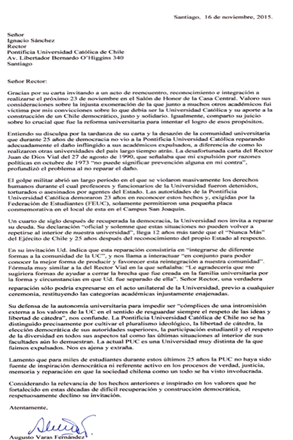 Igualmente, Augusto Varas Fernández respondió al rector Sánchez fundamentando el haber declinado la invitación al acto de reparación: